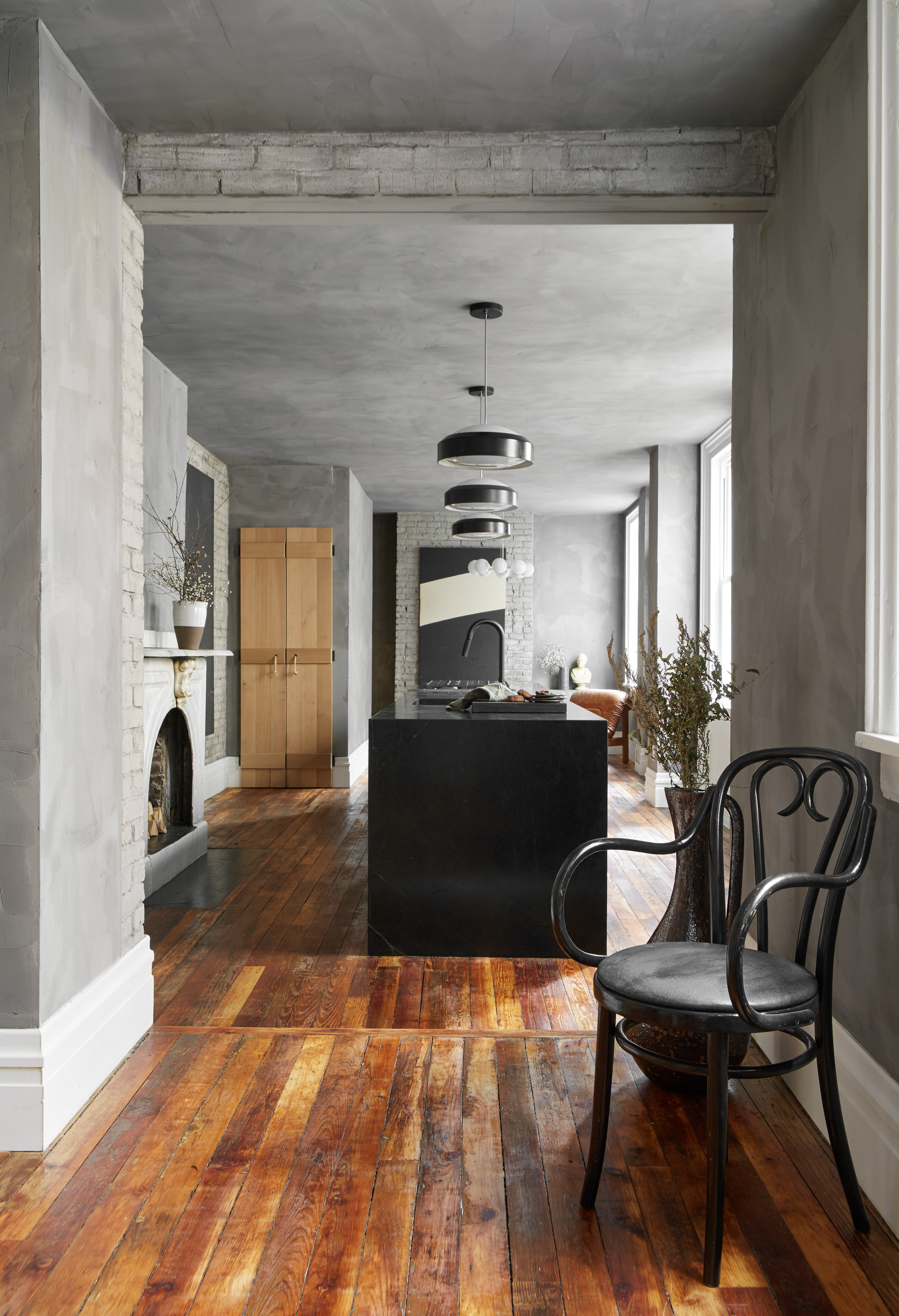 La chose que j’aime vraiment dans cette cuisine, c’est cet îlot épique. Revêtu de pierre ollaire en cascade, il abrite tous les éléments essentiels de la cuisine – l’évier, la cuisinière et le four sont tous bien rangés là-dedans avec beaucoup d’espace de comptoir à revendre. Des pendentifs vintage avec des accents noirs attirent le regard vers le haut. Conçue par , Leanne Ford, cette cuisine toute grise réside dans une maison du 19ème siècle à Pittsburg, mais elle adopte une approche totalement nouvelle du concept de cuisine