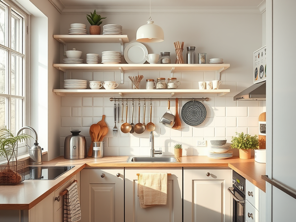 - Des accessoires multifonctions : choisissez des objets qui servent à la fois de rangement et de décoration, comme un panier ou une étagère porte-épices.