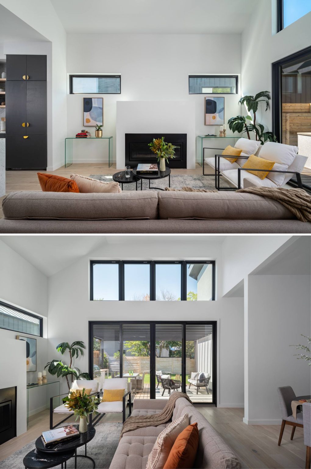 Le salon, à la fois ouvert et baigné de lumière, respire une atmosphère d’invitation à la découverte. Son plafond voûté majestueux et ses grandes fenêtres embrassent l’extérieur, laissant entrer la beauté du monde. Une palette minimaliste de murs blancs éclatants, de fenêtres aux cadres noirs élégants et d’un mobilier aux tons neutres évoque une douceur apaisante, réchauffée par des touches délicates et subtiles. Au cœur de cet espace, une cheminée aux lignes épurées crée un point d’ancrage, tandis que des consoles en verre étincelantes et des œuvres d’art abstraites insufflent un équilibre captivant qui émerveille les sens.